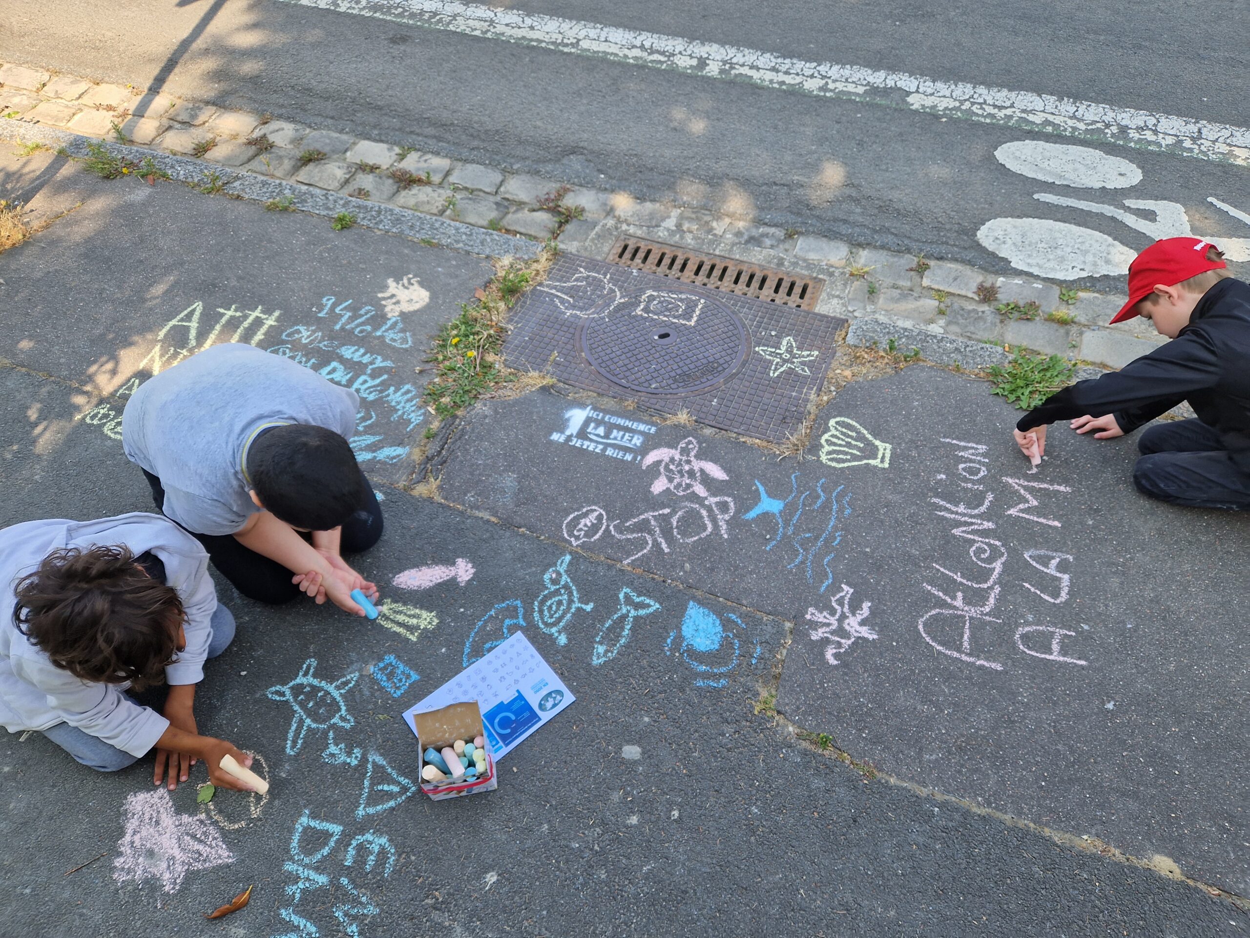 A l’occasion de la journée mondiale des océans, le 8 juin 2023, présentation du projet Plastique à la Loupe à des élèves de CM2 puis inscription du message « Ici commence la mer, ne jetez rien » autour des grilles d’évacuation d’eaux pluviale du quartier.